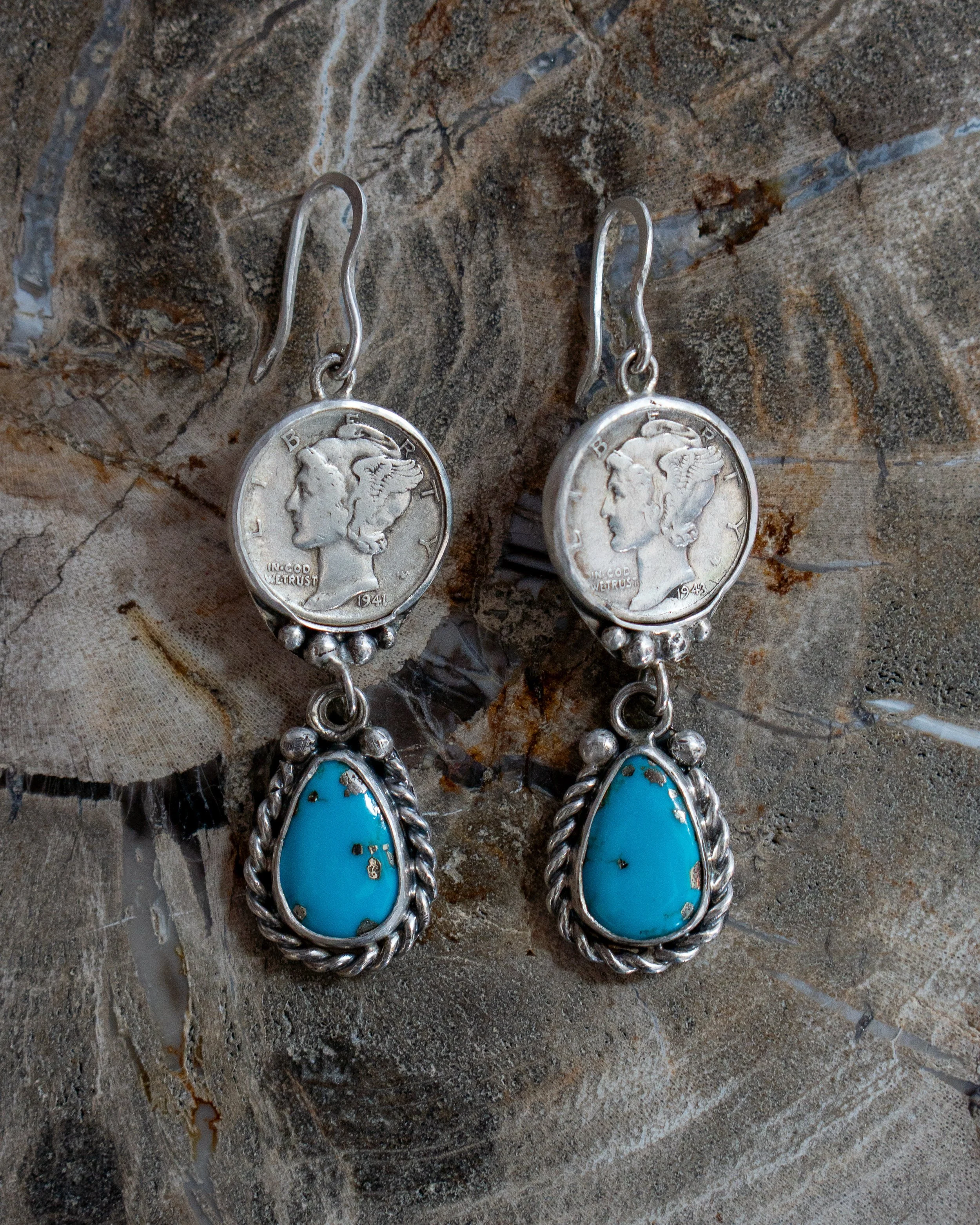 Shop › Mercury Dime Earrings Image 1 of 1 Mercury Dime Earrings $110.00 Sold Out Made from sterling silver, Compitos turquoise, and American mercury dimes. Sold Out Added! Made from sterling silver, Compitos turquoise, and American mercury dimes.